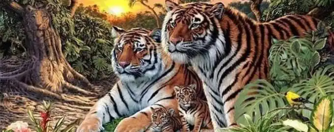 Na obrázku je krásná scéna dvou dospělých tygrů a jejich mláďat v lese. Odkaz zkopírován Optická iluze / Playbuzz Nový optický klam vážně zmátl svět.