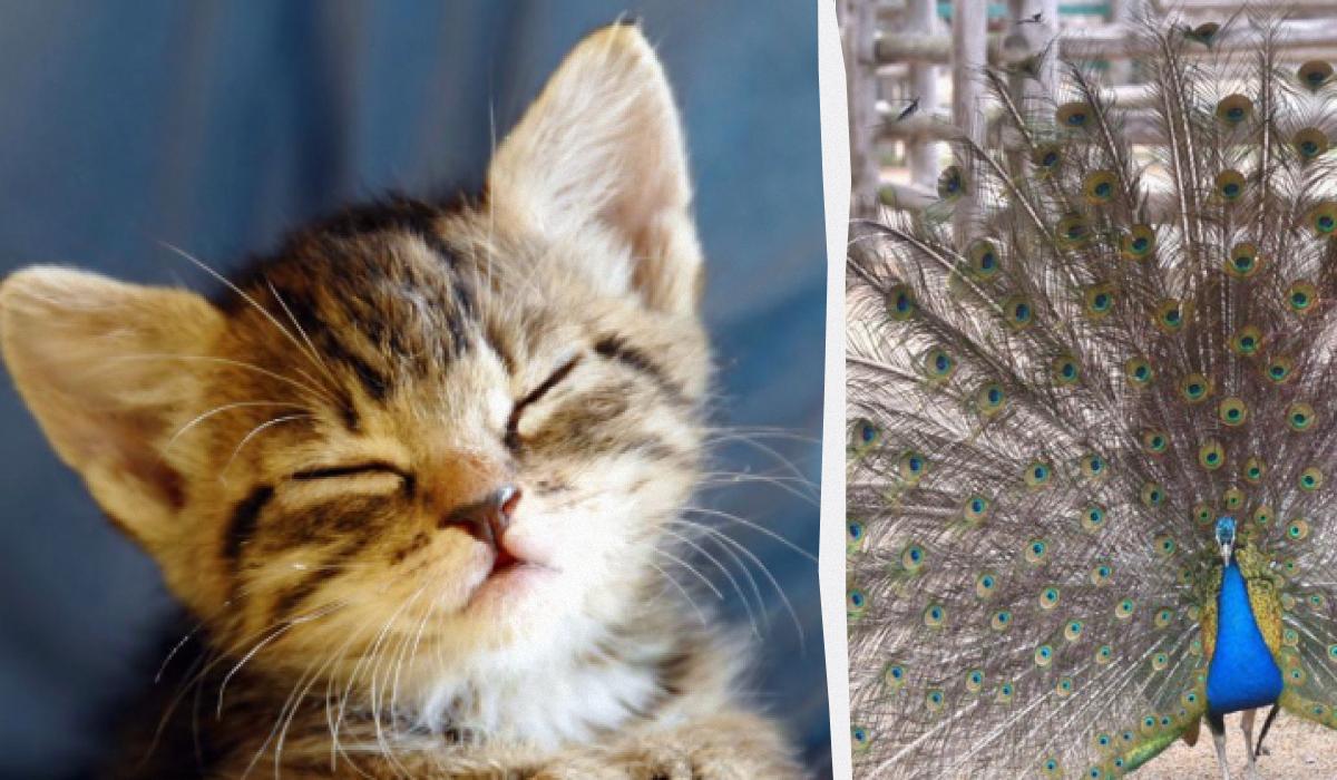 Kotě bylo za pavím ocasem / koláž z fotografie Mojeu