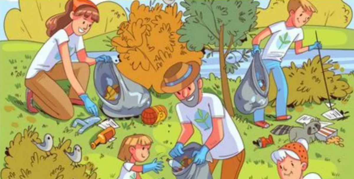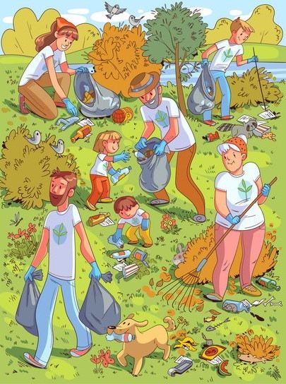 Na obrázku jsou rodiny s dětmi, které přišly do parku uklidit tamní odpadky. Jsou tam i ptáci a mýval, kteří pozorují, co se děje. Je však třeba najít želvu.