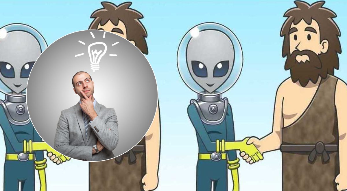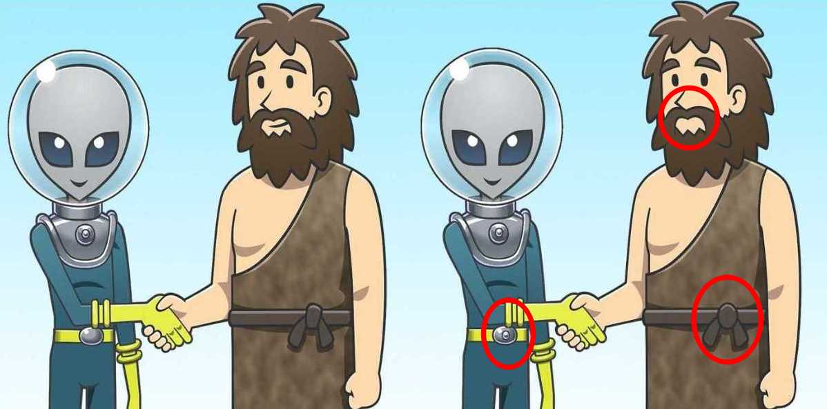 Na prezentovaném obrázku si můžete všimnout dvou stejných mimozemšťanů a dvou jeskynních lidí.