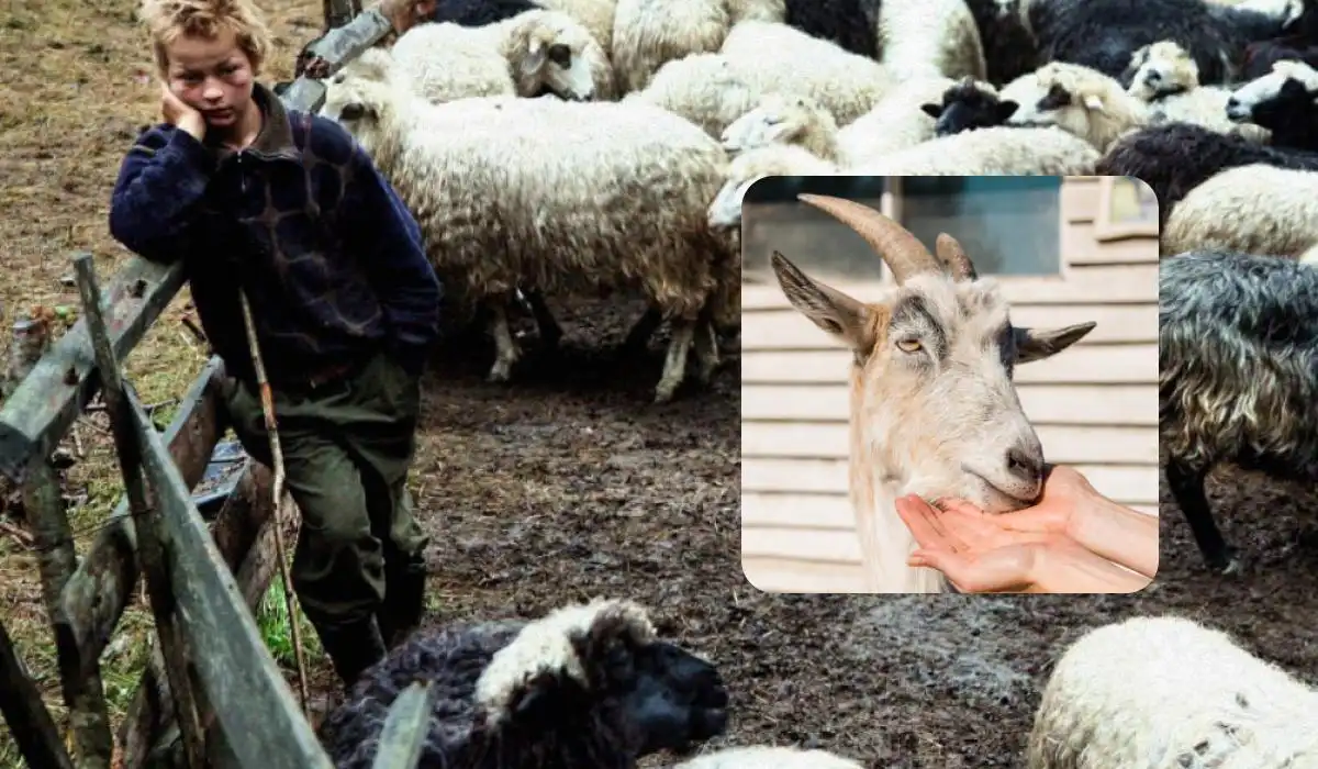 Níže uvidíte fotografii stáda ovcí v ohradě. Můžete si všimnout, že mladý chlapec, který se o ně má starat, to dělá bez většího nadšení. Zřejmě si „podvodníka“ mezi svými svěřenci nevšímá.