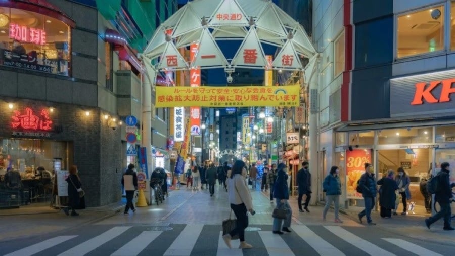Na obrázku vidíme pěší ulici v metropoli, která vede mezi vysokými domy. Ulice je večer osvětlena velkým množstvím luceren a pohybuje se po ní spousta lidí.