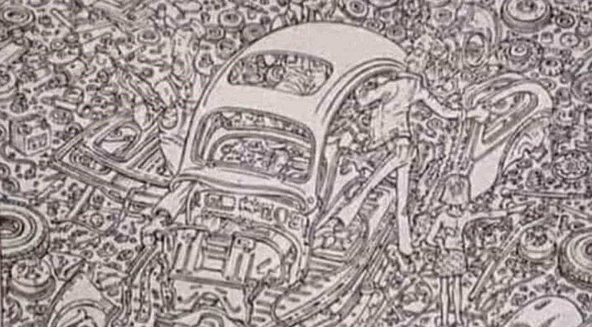 Na obrázku – muž sedí v garáži, kde je spousta náhradních dílů. Uprostřed je rozebrané auto a vedle muže – zřejmě – manželka, která ho přišla zavolat domů. Naším úkolem je najít zde kočku.