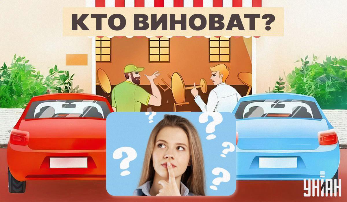 Níže uvidíte obrázek rozbité restaurace a dvou aut. Řidiči se hádají, kdo způsobil zmatek. Každý z nich obviňuje toho druhého, že nehodu způsobil on.