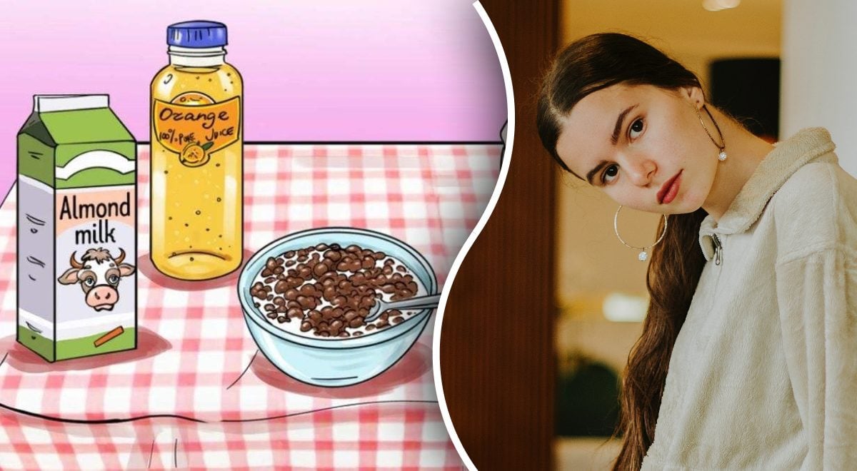 Na obrázku vidíme misku cereálií zalitou mlékem, lákavou čokoládovou sušenku, láhev osvěžujícího pomerančového džusu a krabici zdravého mandlového mléka. Na první pohled není na obrázku žádná chyba. Ale to je přesně ten případ, kdy byste neměli věřit prvnímu dojmu.