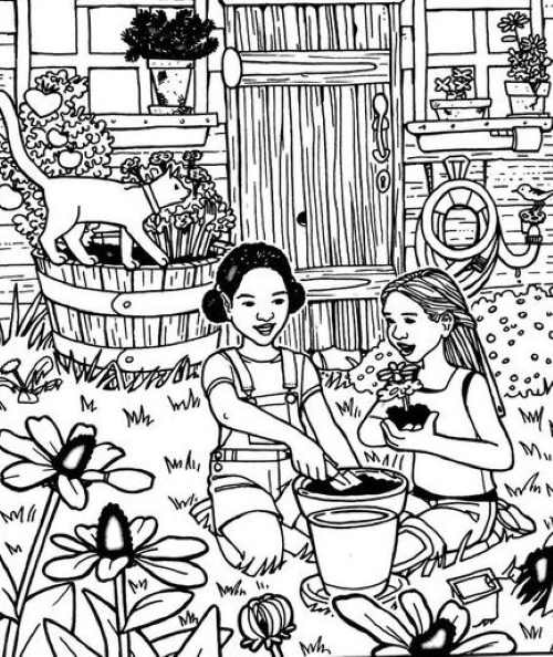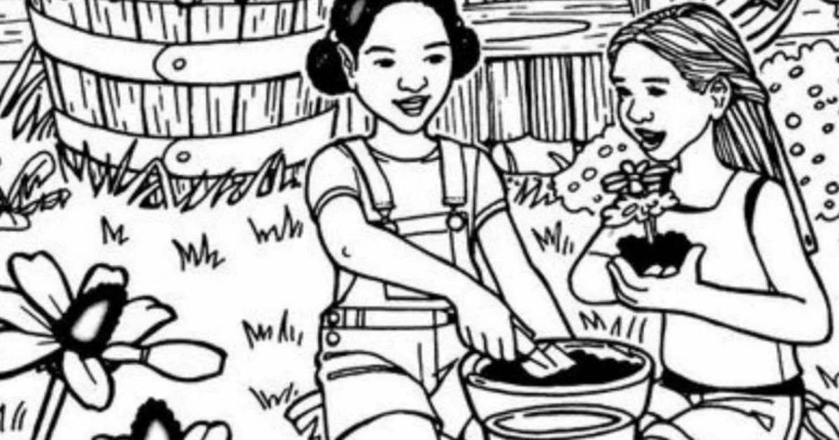 Na obrázku jsou dvě dívky, které přesazují květiny na dvoře na pozadí domu. Někde poblíž nich je prsten a my ho musíme najít.